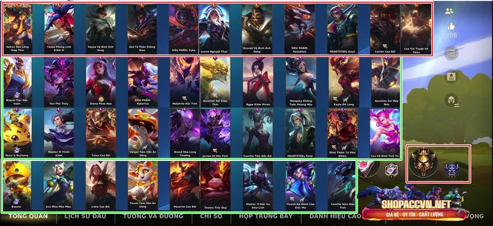 ✅SIÊU PHẨM: FULL TƯỚNG -2 SKIN VÀNG - 15 SKIN ĐỎ - 76 SKIN TÍM ✅DƯ 95K TINH HOA LAM